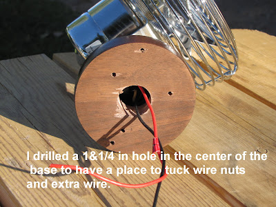 After thinking about the “problem” for a day or two I reasoned that if I could get a disc of walnut to use as a mounting block that in the comfort of an outdoor picnic bench workshop I could attach the fans to disc and then run two screws up into the mounting disc to secure the whole assembly to the TV cabinet.